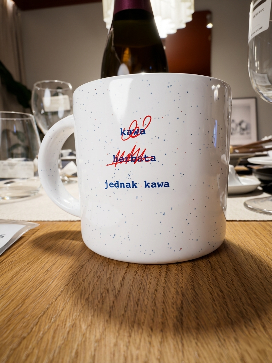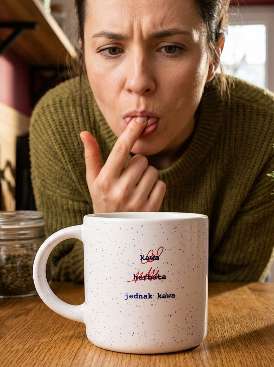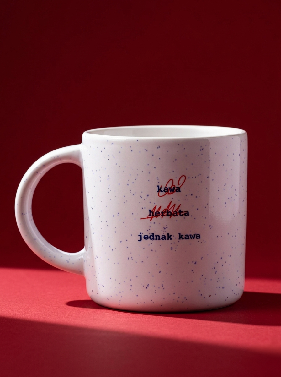Poranny pobyt w kuchni często sprowadza się do bezcelowego wpatrywania w czajnik, albo ekspres do kawy. Ten kubek dokumentuje stan, w którym nie wiesz, na co masz ochotę, ani co właściwie powinieneś wypić. Zamiast zmuszać się do wysiłku umysłowego tuż po przebudzeniu, naczynie oferuje gotowy zapis codziennego wahania.