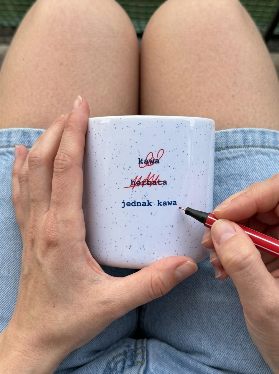 Grafika precyzyjnie podsumowuje ten dylemat. Najpierw pojawia się chęć na kawę, zaraz potem racjonalna wątpliwość i próba oszukania organizmu herbatą, by ostatecznie skapitulować i wrócić do punktu wyjścia. Nadruk zdejmuje z barków ciężar wyboru – weryfikacja opcji została już przeprowadzona i przekreślona czerwonym markerem. Choć zawsze coś przekreślić i dodać swój punkt widzenia.