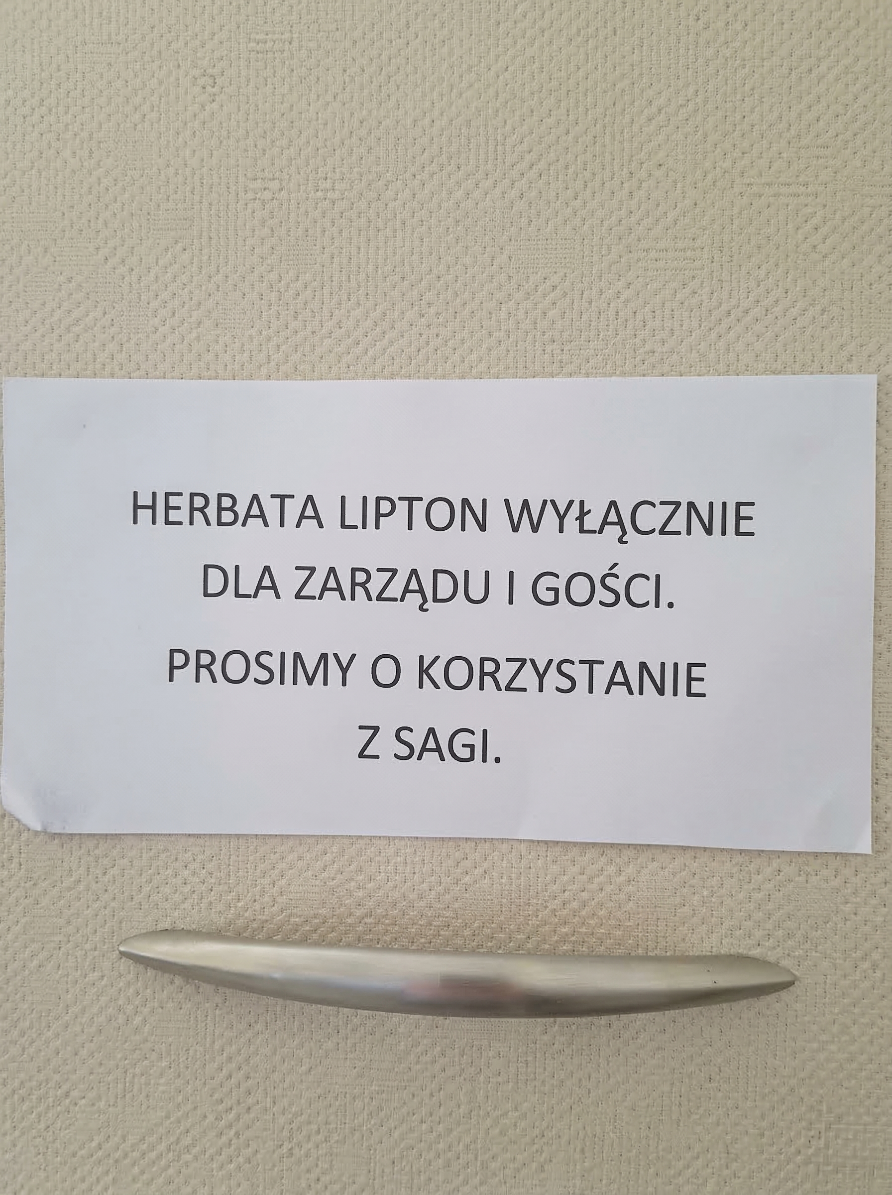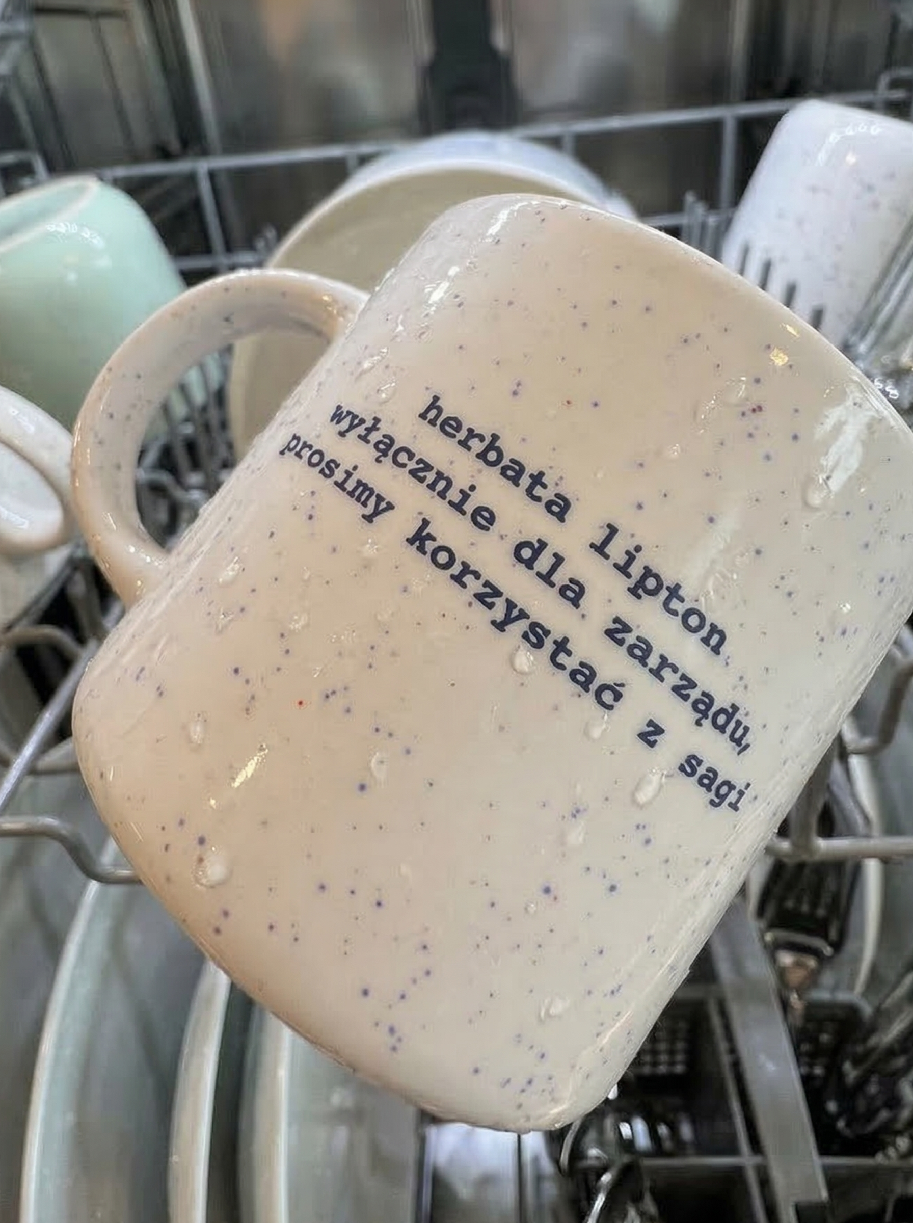 To naczynie z kropkami i tym napisem to definicja kastowości, ale na wesoło. Pijesz swoją najtańszą Sagę z kartonu i patrzysz z boku na te drogie, luksusowe piramidki Liptona, które leżą za zamkniętą szafką u asystentki prezesa. I wiesz co? Saga też klepie, a przynajmniej nie musisz się pocić na zebraniach o prognozy kwartalne. Bycie plebsem od Sagi ma swoje plusy.